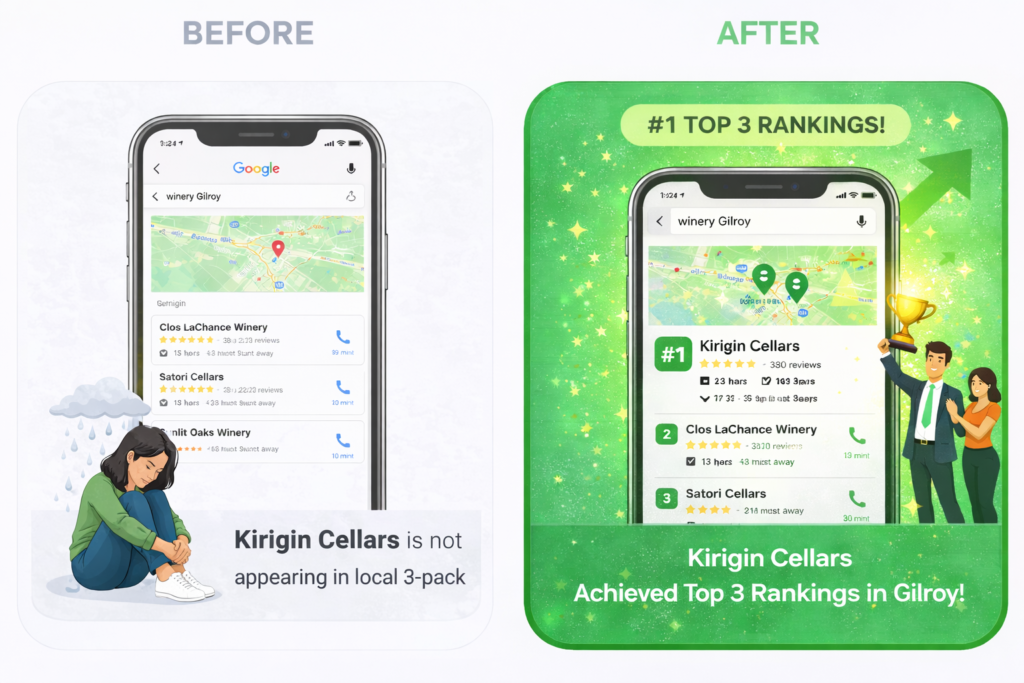 Moved from low visibility to Top 3 Google Maps rankings in the Gilroy area, driving a massive increase in direction requests and tasting room visits.
