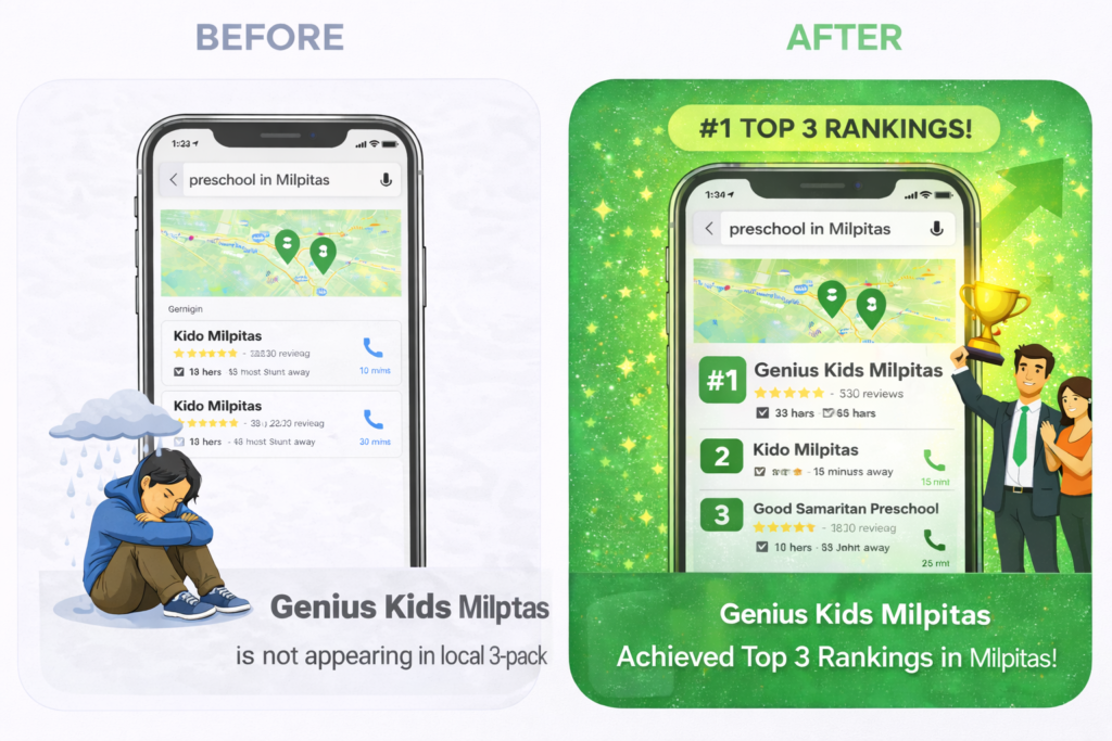 Moved from low visibility to Top 3 Google Maps rankings in Milpitas for “Preschool” and “Daycare Near Me,” resulting in increased calls, direction requests,
